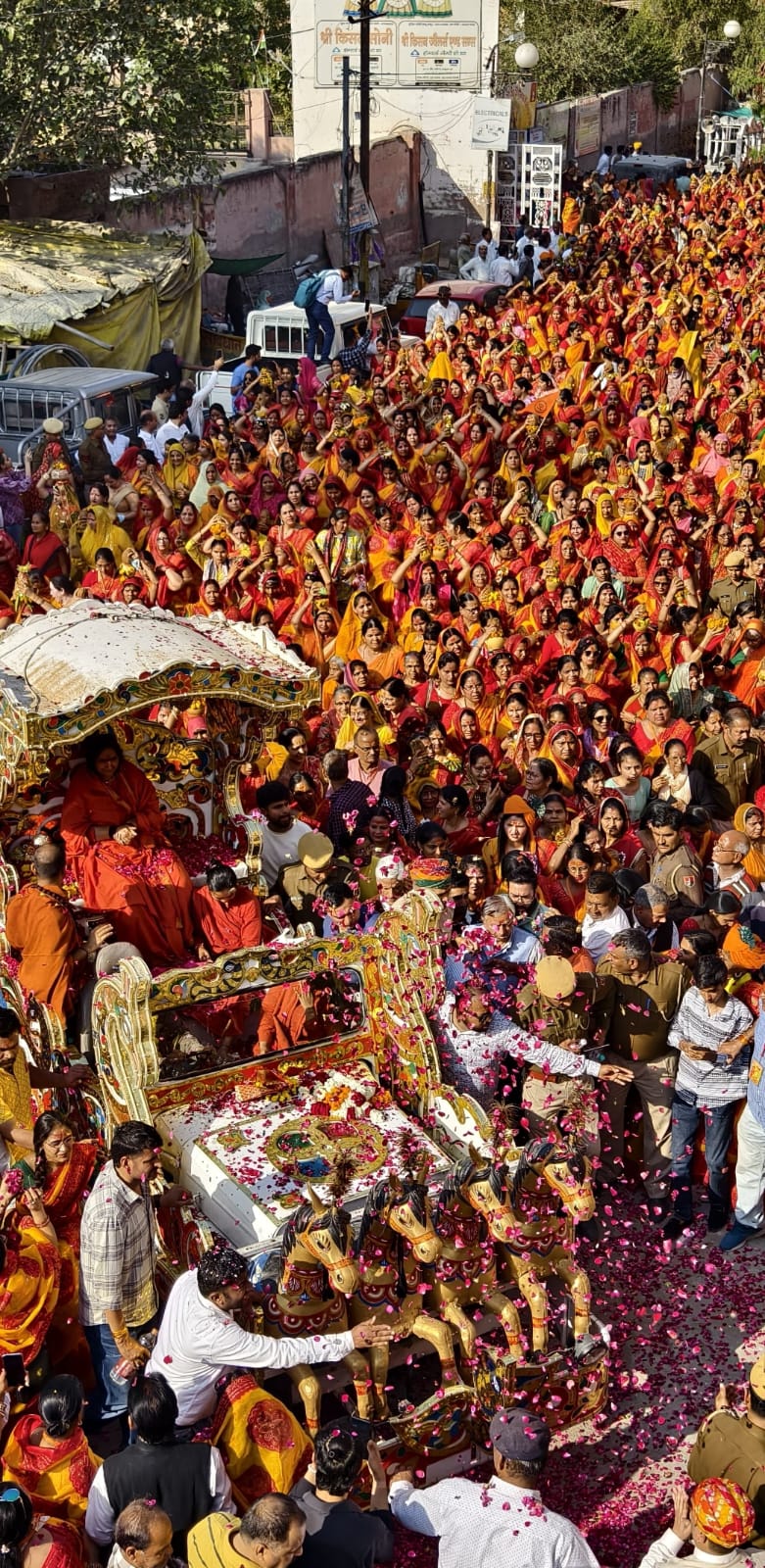 साध्वी ऋतंभरा शनिवार सुबह बीकानेर के नाल हवाई अड्डे पर उतरीं। उनके सम्मान में विशालकाय कलश यात्रा निकाली गई। यह शोभायात्रा लक्ष्मीनाथ मंदिर प्रांगण से शुरू हुई इस दौरान महाराष्ट्र से आए एक घोष दल ने शानदार प्रदर्शन किया शोभायात्रा में आगे आगे महाराष्ट्र के घोष वक चल रहे थे उनके पीछे 1500 से अधिक महिलाएं एक ही गणवेश में सिर पर कलश लेकर इस यात्रा में शामिल हुई। यह कलश यात्रा बड़ा बाजार, आचार्यों का चौक, मरूनायक चौक, मोहता चौक, तेलीवाड़ा होते हुए दाऊजी मंदिर पहुंची ।जहां पहले से मौजूद साध्वी ऋतंभरा एक रथ में सवार हुई फिर शोभायात्रा यहां से जोशीवाड़ा, कोटगेट होते हुए पुरानी जेल रोड स्थित धुनीनाथ गिरी मठ पंच मंदिर पहुंचकर विसर्जित हो गई। यह संपूर्ण यात्रा महामंडल मंडलेश्वर स्वामी विशोकनन्द जी के सानिध्य में संचालित हुई। इस शोभा यात्रा का जगह-जगह पुष्प वर्षा से स्वागत किया गया। इस कलश यात्रा में पर्यावरण प्रेमी सीताराम कच्छावा सपत्नीक भागवत कथा को सिर पर धारण करते हुए चले।