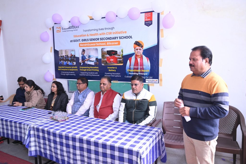 इससे पहले भामाशाह चन्द्रेश हर्ष व महावीर रांका ने कम्प्यूटर लैब का फीता काटकर उद्धटन किया। कार्यक्रम का संचालन करते हुए वरिष्ठ उद्घोषक रविन्द्र हर्ष ने बताया कि चन्द्रेश जी बालिका शिक्षा को समर्पित व्यक्तित्व है। विगत 2 फरवरी को ही उन्होंने हर्षों के चौक में स्थित राजकीय बालिका स्कूल में छात्राओं के लिए डिजिटल बोर्ड, आरओ प्लांट तथा बड़ा इर्न्वटर भेंट किया है। उन्होंने बताया कि प्रेरक हर्षवर्द्धन हर्ष ने चन्द्रेश जी को बारहगुवाड स्कूल में संचालित कम्प्यूटर लैब् की दयनीय स्थिति से अवगत कराया तो उन्होंने तत्काल 11 कम्प्यूटर देने की घोषणा कर दी जो आज फलीभूत भी हो गई है। रविन्द्र हर्ष ने बताया कि चन्द्रेश हर्ष के सुपुत्र कुमार गौरव हर्ष की कंपनी सीएसआर समूह क्यूबेशन के सौजन्य से संभव हुआ है। समूचा हर्ष परिवार समय समय पर समाजोपयोगी काम करता आ रहा है। यह कंपनी चार देशों में संचालित हो रही है। कार्यक्रम के अंत में स्कूल प्रिसिंपल विनिता चौहान ने भामाशाह चन्द्रेश हर्ष का आभार ज्ञापित किया और उनका परिचय कराया। उन्होंने कहा कि यदि आज हमें कम्प्यूटर नहीं मिलते तो संभव है कि यह लैब ही हमेशा के लिए बंद हो जाती मगर भामाशाह हर्ष के प्रयासों से हमारी लैब को जीवनदान मिला है। उन्होंने भामाशाह के रूप में चन्द्रेश हर्ष व महावीर रांका का शॉल, साफा व माला पहनाकर अभिनंदन किया गया। इस दौरान शारीरिक शिक्षिका डॉ कृष्णा आचार्य ने अभिनंदन पत्र का वाचन किया। कम्प्यूटर अनुदेशक अंजली आचार्य ने बताया कि यहां बरसों पहले कम्प्यूटर लगे थे मगर वे नई तकनीक से लैस नहीं है। यहां पर 183 छात्राएं कम्प्यूटर शिक्षा जैसे विषय में पढाई कर रही है मगर अब आधुनिक कम्यूटर सैट आने से इन छात्राओं को बड़ी राहत मिलेगी और वे डिजिटल शिक्षा हासिल करने में सफल होगी।